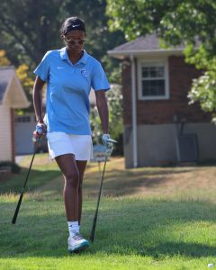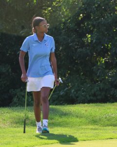 Varsity girls golf battle it out at the Four Seasons Country Club Sept. 30. The girls claimed victory over both Rockwood Summit 177-202 and Parkway Central 177-194. “The course was in pretty bad shape from the lack of rain,” golf coach Riley Keltner said. “But they were able to pull out a win and it got us to an undefeated season.”