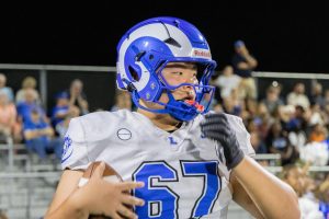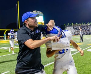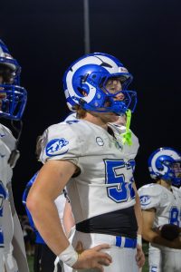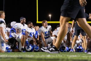 After a victorious comeback to end the game 14-10 against Lindbergh High School, Tyler Anderson (10) and his teammates huddle around Coach Adam Hamilton to perform a chant. This game marked the second win of the season for the Rams, who were behind 0-10 in the first quarter. For Anderson, the win evoked a greater sense of camaraderie and team pride. “We love each other, we support each other,” Anderson said. “We’re really a team under one man.”